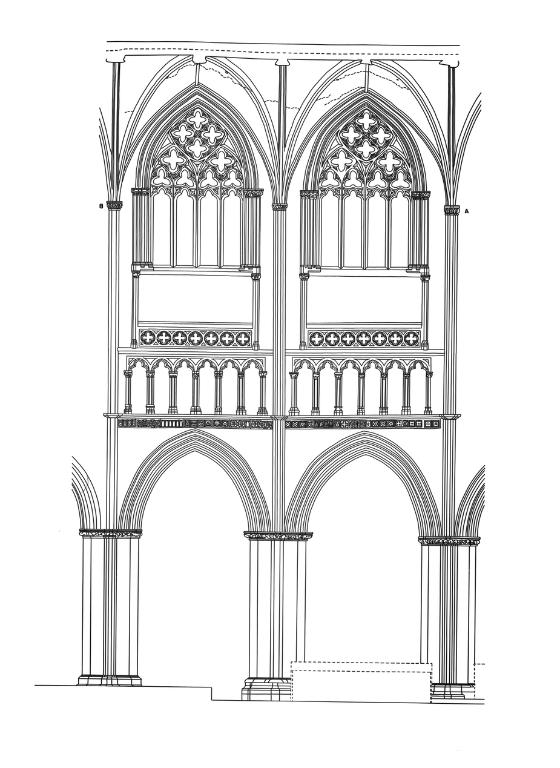Le transept, dont la longueur (36 m) est égale à celle de la nef, impressionne par son parti pris de muralité. Si ses parois est et ouest présentent la même ordonnance que le chœur et la nef, la moitié inférieure des murs-pignons est constituée d’un massif de maçonnerie nue surmonté, à la base de la grande fenêtre, d’une coursière à garde-corps quadrilobé reliant les galeries latérales du triforium. Les arcs richement moulurés qui délimitent la croisée, à peine brisées au nord et au sud, en cintre légèrement surbaissé à l’ouest et à l’est, possèdent une vraie puissance monumentale. À l’entrée du chœur, chaque tore retombe sur une colonnette ; sur les autres côtés, la plupart des moulures pénètrent directement dans les piles.