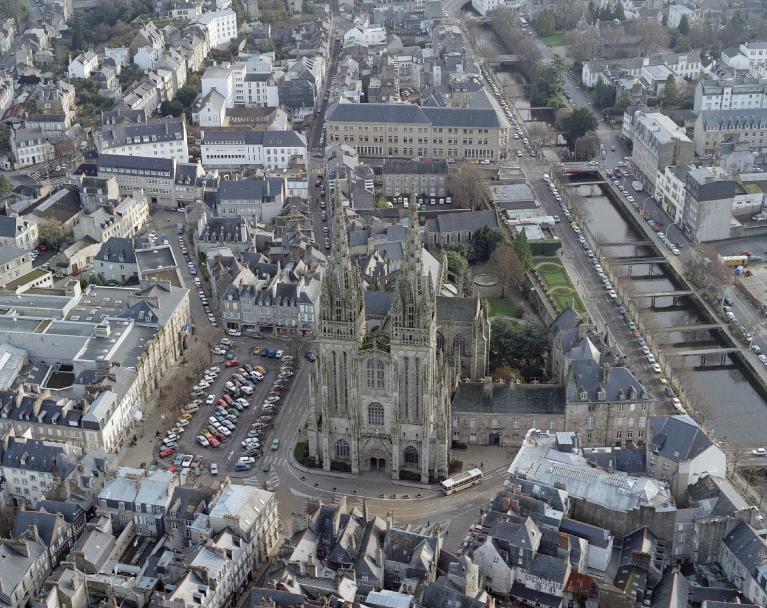 De l´édifice roman, bâti à la fin du 11e siècle, ne subsiste qu´un chapiteau conservé au musée voisin. La cathédrale était alors intégrée dans un ensemble comprenant un baptistère, qui existait encore en 1440, et une chapelle dédiée à Notre-Dame, fondée en 1031 par le comte Alain Canhiart. Des fouilles ont montré que les bâtisseurs de la cathédrale gothique utilisèrent comme soubassement les murs, arasés avec soin, d´un édifice antérieur orienté, dont on ignore la fonction et la date. Le projet de reconstruire la cathédrale est attribué à Rainaud, un clerc français dont Pierre de Dreux avait fait son chancelier et qu´il avait récompensé par l´évêché de Quimper en 1219. En 1239, l´évêque et le chapitre donnent l´impulsion décisive en cédant à la fabrique le produit des annates, mais les travaux ne devaient guère être avancés à sa mort en 1245. Il semble qu´en 1261, à la mort de l´évêque Hervé de Landeleau, son tombeau ait trouvé place au milieu du choeur, entre la deuxième et la troisième travée droite, dont les piliers devaient déjà être implantés. Vers 1280, la construction du bas-côté nord est assez avancée pour qu´on puisse ensevelir, dans sa deuxième chapelle, l´évêque Yves Cabellic. Le chantier connaît un regain d´activité à la fin du 13e siècle. En 1287, un règlement capitulaire suggère que le rond-point est parachevé, au moins pour le registre des grandes arcades, et que l´on peut célébrer l´office dans le sanctuaire. Au même moment, la réédification de la chapelle Notre-Dame-de-la-Victoire touche à sa fin : l´évêque Even de la Forest, décédé en 1290, y est inhumé, et son successeur Alain Rivelen en consacre l´autel en 1295. Dans les années 1330, les travaux se portent sur le flanc sud du choeur, mais la guerre de Succession interrompt le chantier. Malgré le retour à la paix civile, la seconde moitié du 14e siècle constitue une période de stagnation. Les choses changent en 1408 avec la nomination de Gatien de Monceaux : l´épitaphe du nouvel évêque porte à son crédit les voûtes hautes du choeur, qui sont peintes en 1417. Avec le 15e siècle, les données archivistiques se multiplient. Un acte du cartulaire relate la pose de la première pierre des tours, le 26 juillet 1424. La personnalité de l´évêque Bertrand de Rosmadec (1416-1445), conseiller de Jean V, joue un rôle crucial dans l´ouverture du chantier, auquel le duc s´intéresse en personne. Pourtant, la dynamique s´essouffle au bout d´une décennie. En 1436, Eugène IV accorde des indulgences à ceux qui contribueront à l´achèvement de l´oeuvre, précisant qu´on y consacre 2 000 ducats par an, mais que les ressources de la fabrique sont insuffisantes. Le gros-oeuvre de la nef est sans doute presque achevé à la mort du prélat. Les travaux se poursuivent sous les épiscopats d´Alain de Lespervez (1444-1451) et de son neveu Jean (1451-1472), qui lègue par testament 1 000 livres monnaie pour la réparation de l´église. La jonction entre la nouvelle œuvre et le choeur du 13e siècle est opérée avant 1470. En 1467, la charpente de la nef est posée et on passe marché pour celle du bras sud du transept. L´année suivante voit l´édification de la flèche de la croisée. La construction du bras nord du transept occupe la décennie qui s´ouvre en 1475. Grâce à l´intervention de François II, on achève en 1479 le portail du croisillon nord. En 1486, les voûtes du transept, qui portent l´écu de l´évêque Alain Le Maout (1484-1493) et, à la croisée, les armes de Bretagne ceintes d´une cordelière, sont en place. Celles de la nef datent des années 1488 à 1493 : on y retrouve les armes d´Alain Le Maout et de son successeur Raoul Le Moël (1493-1501), qui fait également voûter les deux travées sous les tours. En 1494, un don du roi Charles VIII permet de parachever les parties hautes de la nef et du transept : la pose des verrières est en cours en 1496. Les flèches voulues par Bertrand de Rosmadec sont entreprises sous l´épiscopat de Claude de Rohan (1501-1540), mais elles ne dépassent pas les premières assises ; leurs pyramides tronquées sont couvertes d´une charpente garnie de plomb, état qui subsistera jusqu´au début du 19e siècle. Le 17e siècle est marqué par l´incendie de la toiture de la tour nord (1613), la destruction par la foudre de la flèche de la croisée (1620), puis par la construction d´un jubé (1643) et d´une tribune d´orgue (1644). Sous la Révolution, le jubé est supprimé et la clôture du choeur remplacée par une grille en fer. Le 19e siècle, après deux actes de vandalisme (défiguration du portail ouest en 1820, destruction de l´ossuaire en 1847), se consacre ensuite à une restauration voulue comme le parachèvement idéal de l´édifice médiéval, et mise en oeuvre pendant plus de cinquante ans par l´architecte diocésain Joseph Bigot. Le 20e siècle se contente d´entretenir l´édifice, jusqu´aux travaux considérables menés à partir de 1989. Destinés initialement à remédier aux problèmes de stabilité du choeur, liés à un défaut de conception des culées d´arcs-boutants, ils débouchent sur une restauration générale, dont l´aspect le plus spectaculaire est la restitution dans le choeur d´une polychromie plus ou moins conforme à celle de 1417 et le dégagement sur les voûtes de la nef du faux-appareil, parfaitement authentique celui-ci, de la fin du 15e siècle.