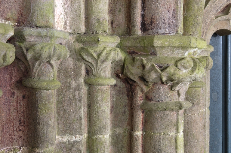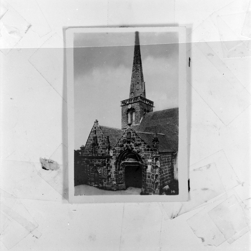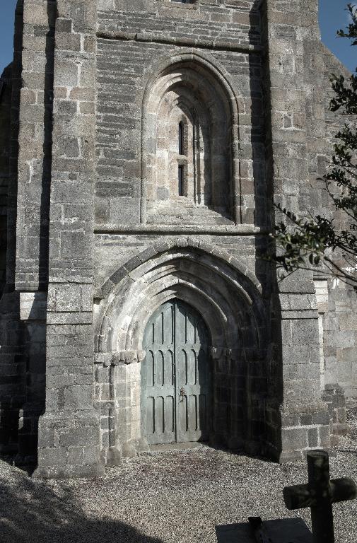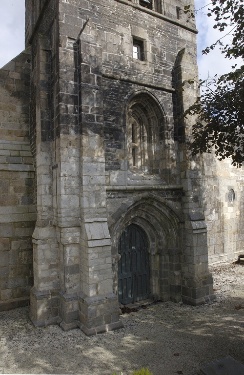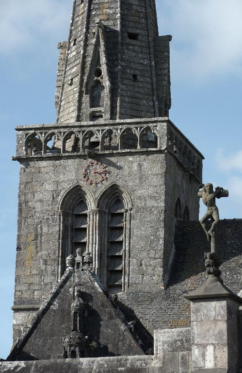La tour-porche La tour-porche, qui présente encore quelques caractères du gothique du XIIIe siècle, fut probablement construite au début du XIVe siècle. Son portail ouest, en tiers-point et sans tympan, présente des voussoirs alternés à cavets, larges redents et tores qui semblent effectivement plutôt se rattacher au XIVe siècle, surtout si on le compare au portail percé au pied de la tour sud de la cathédrale de Saint-Pol qui, avec ses bases à galettes et ses chapiteaux à crochets, est bien du XIIIe siècle. Les étonnantes têtes qui remplacent les chapiteaux rappellent des formes beaucoup plus anciennes empruntées à l’époque romane et font peut-être référence à l’édifice antérieur devant lequel on vint plaquer cette tour. Le reste de l’élévation est homogène. Au-dessus du portail, une baie unique, étroite mais largement ébrasée, éclaire l’intérieur du porche et, très indirectement, la nef à travers l’arcade d’entrée, beaucoup plus haute que la porte ouest. Ce principe, qui sera repris dans de nombreuses églises bretonnes des XVe et XVIe siècles, est ici employé à une date précoce. Au-dessus, un étage intermédiaire éclairé sur ses quatre faces par quatre petites baies simplement chanfreinées, devait correspondre à celui du sonneur de cloches, la petite baie murée actuellement du côté de la nef lui permettant de suivre les offices. Au-dessus, la chambre des cloches est ouverte sur ses quatre faces par des baies géminées à colonnettes et redents à minces chanfreins. Le peu d’évasement de leurs chapiteaux, au demeurant frustes et usés, ainsi que la présence de réglets sur les colonnettes situent cet étage, ainsi que la balustrade de couronnement et la flèche vers la fin du XIVe ou le début du XVe siècle. Enfin la flèche unique, simplement posée sur la plate-forme sommitale sans être cantonnée de clochetons, rappelle, beaucoup plus que les flèches des tours de la cathédrale de Saint-Pol-de-Léon, celles du Trégor. Cette tour-porche devait ouvrir sur une nef sensiblement plus étroite et plus basse que l’actuelle, peut-être l’ancienne chapelle romane sur laquelle on ne sait rien, comme l’indiquent les deux fenêtres de la face est de la tour, occultées aux deux tiers par le toit de la nef.