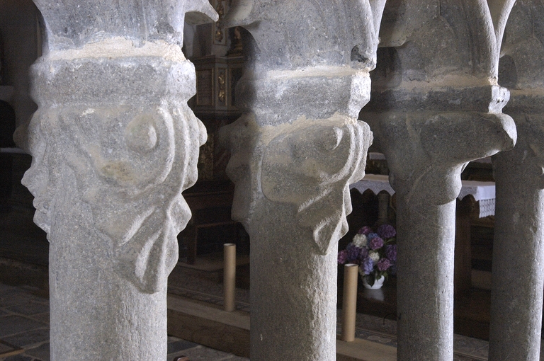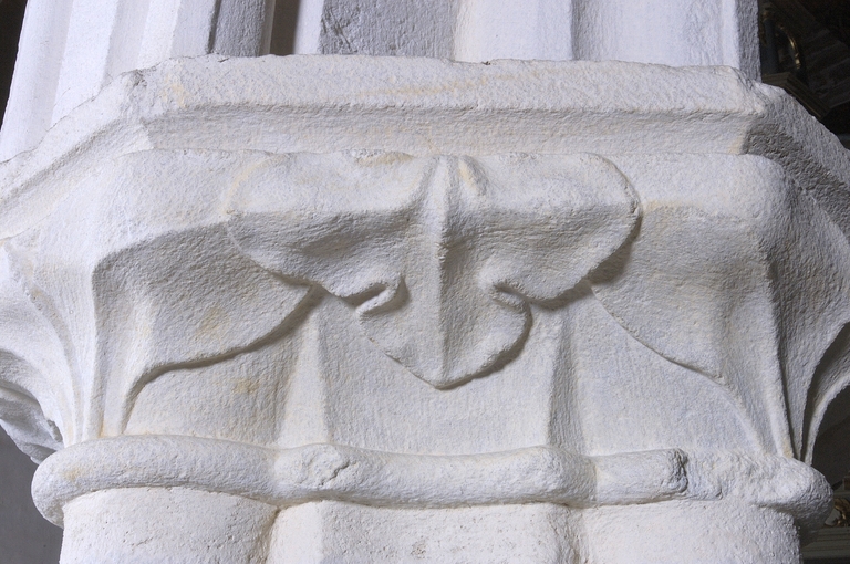 Le parti d’élévation de cette nouvelle chapelle, en particulier le principe de bases carrées disposées en diagonale et servant de socle à des piles cruciformes faisant alterner colonnes et larges pans convexes, peut être compris comme une version simplifiée et schématique des piles du déambulatoire de Saint-Pol-de-Léon. L’absence de voûtes sur les collatéraux de La Martyre, permettant l’économie des colonnettes intermédiaires, le talutage en glacis des bases y est plus flagrant et fait d’autant ressortir la recherche plastique des bases. Au lieu du modèle “ en flacon ” déjà employé dans la métropole léonarde, c’est une version épurée qui n’en retient ici que l’épannelage*, mettant d’autant mieux en valeur la recherche sur les prismes imbriqués. Le traitement des chapiteaux est lui aussi adapté à cette configuration particulière. Au lieu de chapiteaux séparés, les piles sont ici coiffées d’un chapiteau unique continu qui surplombe également les pans concaves de la pile, ne reçoit rien dans cette partie, créant ainsi un effet plastique dynamique tout à fait original. L’épannelage* à profil accentué des chapiteaux n’est pas moins remarquable. Les deux tiers inférieurs très évasés se terminant par une sorte de bourrelet qui revient sous le tailloir, présent aussi à la cathédrale de Saint-Pol, sont ici comme caricaturés. Les larges feuillages souples, stylisés à l’extrême qui se retrouvent sur les chapiteaux du porche sud, rappellent ceux des arcades de la tour de Locronan, édifiée à partir de 1424.