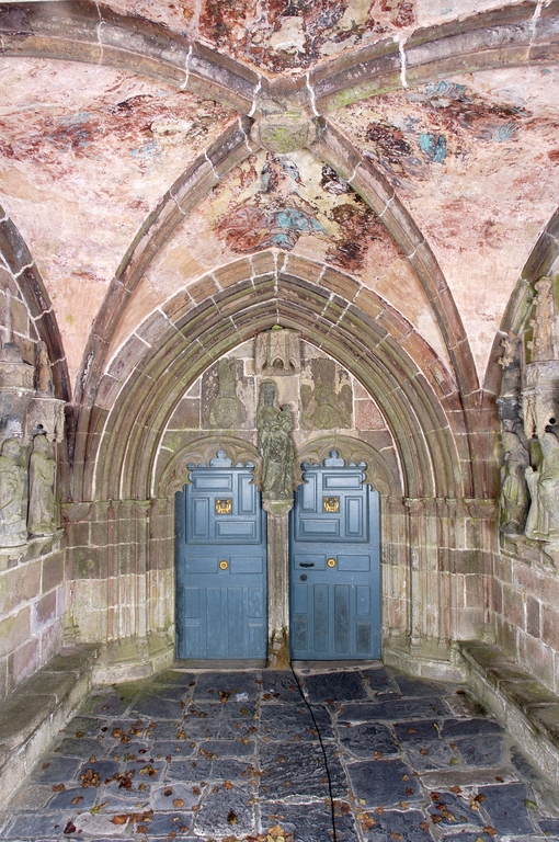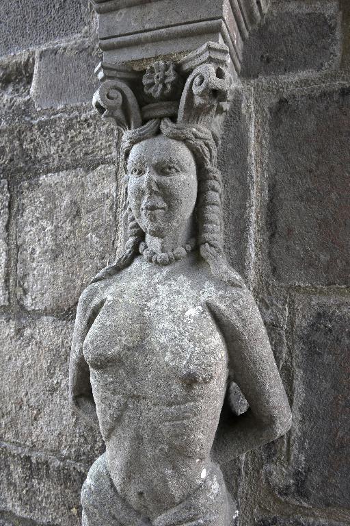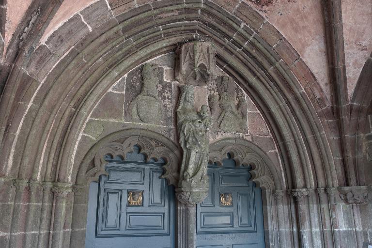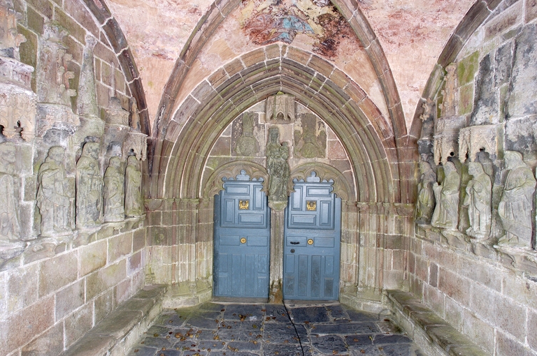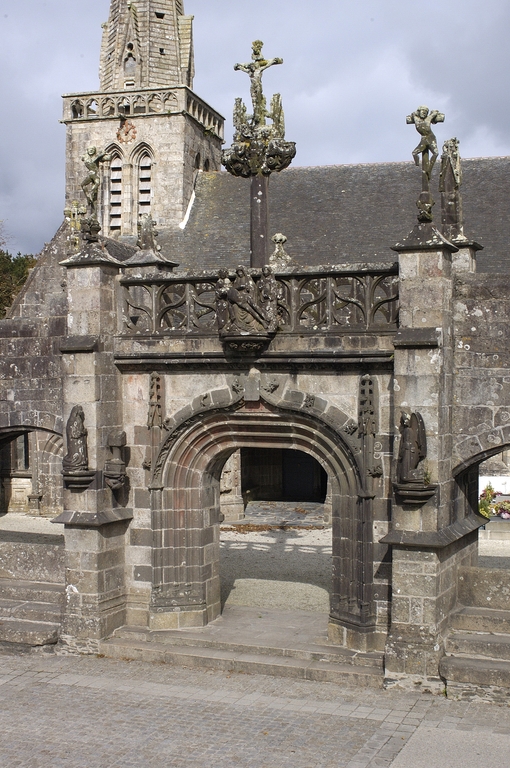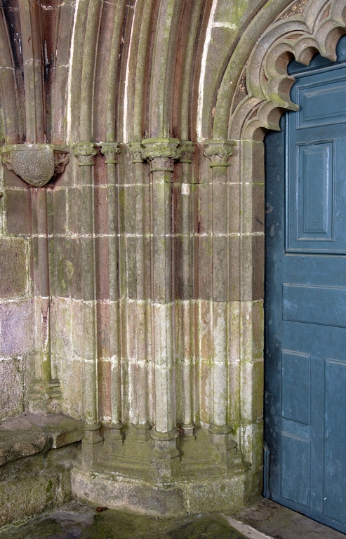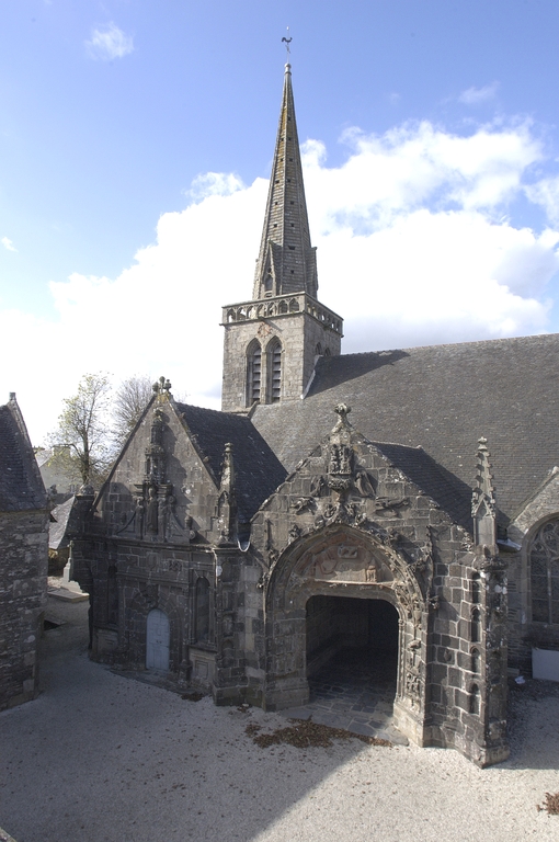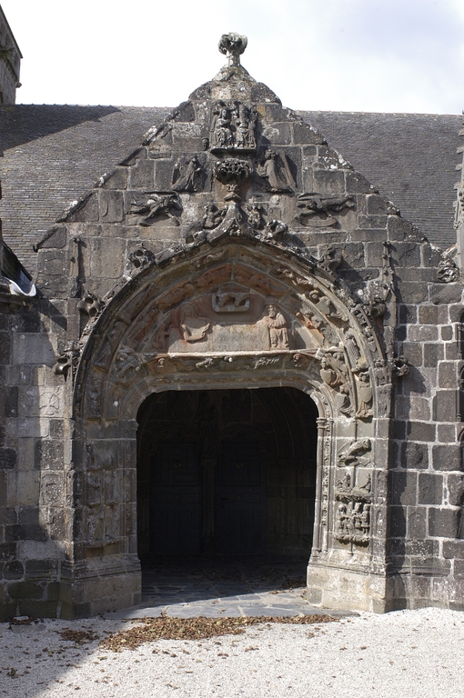 Le porche sud construit en même temps que la deuxième travée de la nef, comme l’indique son revers parfaitement liaisonné avec les arcs-diaphragmes des bas-côtés, le porche sud est entièrement construit en kersantite*. L’emploi de ce matériau, particulièrement adapté à la sculpture, de même que le style de son décor et son iconographie, le rapprochent du grand atelier léonard du Folgoët. Ses contreforts obliques ornés d’une succession de niches sont remarquables. La statuaire qui devait orner ces seize niches n’a pas complètement disparu, mais a été remployée et dispersée à une époque indéterminée sur différentes parties de l’édifice : on retrouve en effet, répartie entre les contreforts du chevet et à l’intérieur de l’église, au droit des piles de la nef, une série de douze statuettes en kersantite*, dont le style et les proportions correspondent parfaitement aux niches aujourd’hui vides du porche. L’arc d’entrée appareillé en forme de linteau à retours en quart de cercle, reprend une forme employée dès les années 1430 sur le portail sud de Quimper. À l’intérieur, les ébrasements de l’entrée sont ornées de multiples colonnettes, de grosseur variée, dont les chapiteaux à souples feuillages et les bases en flacons surmontées d’une doucine saillante d’une exécution parfaite sont caractéristiques des années 1450-1460. Des réglets rehaussent les tores des croisées d’ogives et les colonnettes correspondantes. Le type des arcs plein-cintre des portes jumelées, ourlés d’un feston d’arcs trilobés, empruntés au modèle du Folgoët, se retrouve plus loin identique sur la petite porte sud qui ouvre sur le début du chœur. Dans le tympan, presque entièrement bûchées, figurent à dextre les armes de Rohan, à sénestre celles de Léon, rappel du mariage qui, en 1343, apporta une partie de la vicomté de Léon dans la maison de Rohan. La statue de la Vierge à l’Enfant du trumeau et celles des Apôtres dans les niches latérales datent du XVIe siècle.