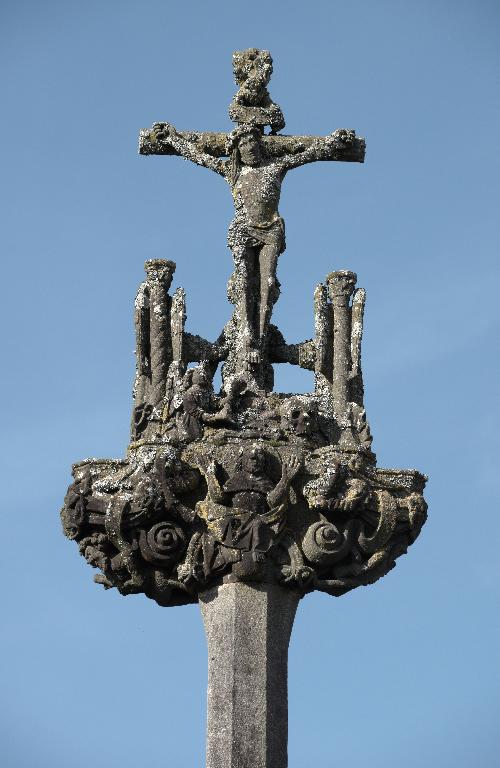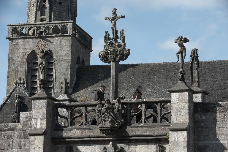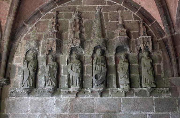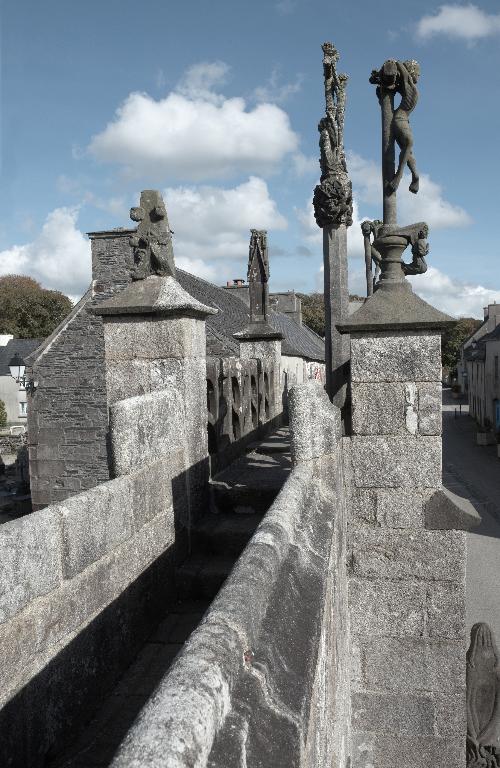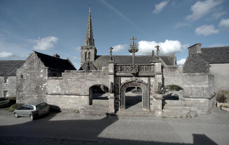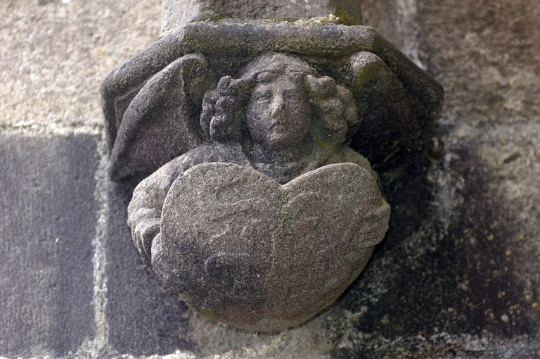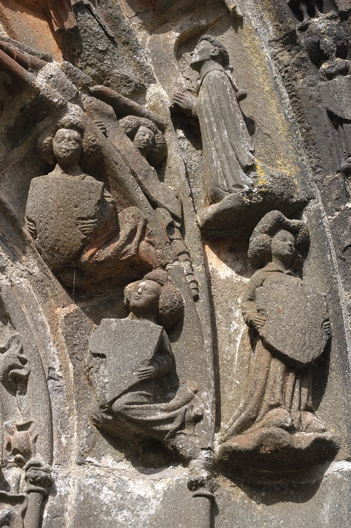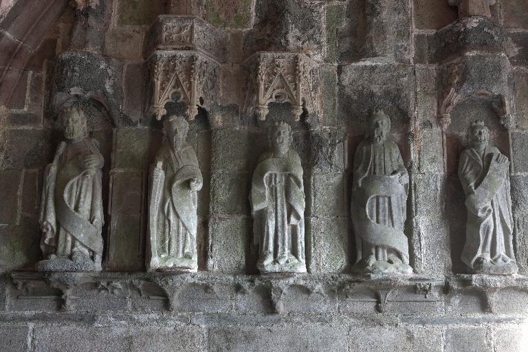 Le porche sud construit en même temps que la deuxième travée de la nef, comme l’indique son revers parfaitement liaisonné avec les arcs-diaphragmes des bas-côtés, le porche sud est entièrement construit en kersantite*. L’emploi de ce matériau, particulièrement adapté à la sculpture, de même que le style de son décor et son iconographie, le rapprochent du grand atelier léonard du Folgoët. Ses contreforts obliques ornés d’une succession de niches sont remarquables. La statuaire qui devait orner ces seize niches n’a pas complètement disparu, mais a été remployée et dispersée à une époque indéterminée sur différentes parties de l’édifice : on retrouve en effet, répartie entre les contreforts du chevet et à l’intérieur de l’église, au droit des piles de la nef, une série de douze statuettes en kersantite*, dont le style et les proportions correspondent parfaitement aux niches aujourd’hui vides du porche. L’arc d’entrée appareillé en forme de linteau à retours en quart de cercle, reprend une forme employée dès les années 1430 sur le portail sud de Quimper. À l’intérieur, les ébrasements de l’entrée sont ornées de multiples colonnettes, de grosseur variée, dont les chapiteaux à souples feuillages et les bases en flacons surmontées d’une doucine saillante d’une exécution parfaite sont caractéristiques des années 1450-1460. Des réglets rehaussent les tores des croisées d’ogives et les colonnettes correspondantes. Le type des arcs plein-cintre des portes jumelées, ourlés d’un feston d’arcs trilobés, empruntés au modèle du Folgoët, se retrouve plus loin identique sur la petite porte sud qui ouvre sur le début du chœur. Dans le tympan, presque entièrement bûchées, figurent à dextre les armes de Rohan, à sénestre celles de Léon, rappel du mariage qui, en 1343, apporta une partie de la vicomté de Léon dans la maison de Rohan. La statue de la Vierge à l’Enfant du trumeau et celles des Apôtres dans les niches latérales datent du XVIe siècle.