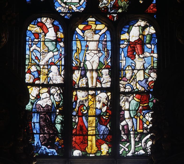 Le chevet de 1530 Vers 1530, le chevet de l’église est reconstruit sur le modèle à pans et pignons multiples dit “ Beaumanoir ”, selon une mode nouvelle venue du Trégor et qui se répand rapidement durant le premier quart du XVIe siècle dans tout l’Ouest de la Bretagne. Cette transformation est consacrée par l’installation après 1535 de trois superbes vitraux, illustrant le cycle de la Passion, d’après des cartons du graveur anversois Jost de Negcker, dans lesquels figurent au premier plan les donateurs René de Rohan et son épouse Isabeau d’Albret. Dans l’allège de la fenêtre centrale, une petite baie située au niveau du regard des pèlerins devait permettre d’entrevoir de l’extérieur, derrière le maître-autel, un reliquaire, disposition que l’on retrouve un demi-siècle plus tôt au chevet de Saint-Jean-du-Doigt.