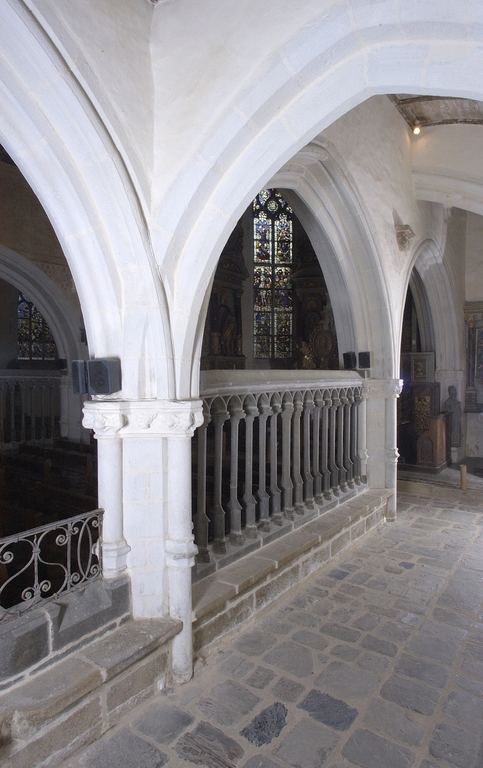 Le parti initial est conservé pour l’essentiel sur le côté sud, qui présente encore son collatéral d’origine dont chaque travée est marquée par un arc-diaphragme en tiers-point faisant la jonction entre les murs gouttereaux et le vaisseau principal. Ces arcs constitués de deux rouleaux à large chanfrein, se croisent avec les arcades de la nef, dont la mouluration plus riche est composée de tores à listels alternant avec de larges redents simplement chanfreinés. Le croisement de ces arcs, presque exagéré, est parfaitement visible au niveau de toutes les piles du collatéral sud à l’exception de celle de l’arc-diaphragme séparant la nef du chœur où une colonnette flanquante reçoit l’arc transversal. En revanche, du côté de l’ancien collatéral nord, les traces de ces croisements ne se retrouvent qu’à partir des piles du chœur. Cette différence tendrait à prouver que l’on a d’abord commencé l’édification de la nouvelle chapelle par le côté nord du bas de la nef, vers 1420-1430, l’idée d’arcs transversaux formant comme des arcs-boutants intérieurs n’intervenant qu’à partir de l’édification du côté sud. Ce principe du croisement des arcs se retrouve dans le déambulatoire de la cathédrale de Saint-Pol-de-Léon, après 1435. Il faut également remarquer que ce nouveau parti architectural est connexe à l’édification du porche sud : le revers de ce dernier présente un massif de maçonnerie en pierre de taille qui inclut dans ses lits les tambours des colonnes engagées de la retombée des arcs transversaux.