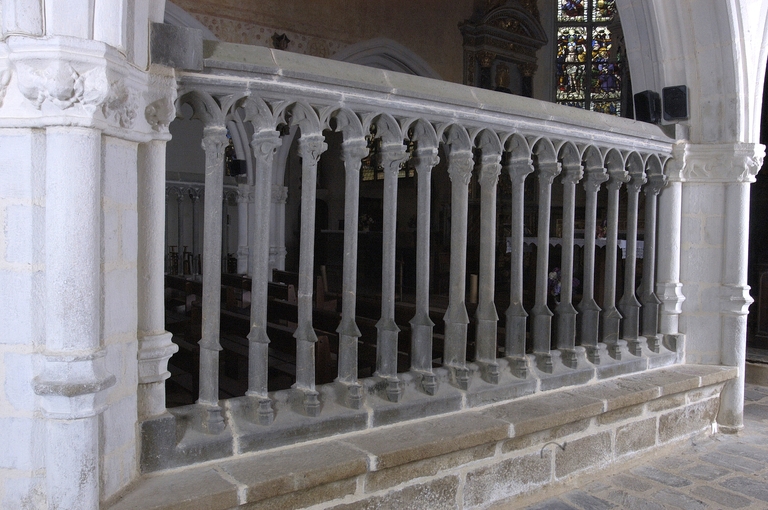 Le chancel de La Martyre figure parmi les trois exemples conservés en Bretagne de clôture de chœur gothique en pierre, avec celles du Folgoët et de la cathédrale de Saint-Pol-de-Léon. Son tracé, qui vient légèrement en avant des arcades de la deuxième travée du chœur, ménageait un passage transversal entre l’extrémité de la nef, marquée par un grand arc-diaphragme, sans doute alors fermé par une autre clôture ou un jubé en bois, et le sanctuaire lui-même délimité par cette clôture. La petite porte ouverte à ce niveau dans le bas-côté sud, d’un style parfaitement semblable à celles du porche sud, devait permettre au clergé et aux privilégiés d’avoir un accès direct dans la zone du sanctuaire, en passant par-delà une autre clôture actuellement disparue qui séparait la nef du chœur. Cette première travée du chœur fonctionnait alors comme une sorte de circulation transversale, à l’instar d’une croisée de transept, reprenant en cela dans des proportions beaucoup plus modestes les dispositions anciennes de la cathédrale de Saint-Pol. Cette double fermeture du chœur, qui n’est plus visible aujourd’hui, explique sans doute que l’arcade de la dernière travée du chœur soit maintenue libre, disposition que l’on retrouve également dans la clôture de chœur du Folgoët. Le style du chancel, probablement aussi inspiré du modèle saint-politain, constitue toutefois une réalisation originale et remarquable. En partie basse, les colonnettes cylindriques et minces ont leur section inférieure curieusement élargie en profil ondoyant pour venir s’adapter sur les bases en flacon émergeant de chaque côté du chaperon. À leur sommet, de délicats feuillages sculptés forment encorbellement à l’extérieur et à l’intérieur pour soutenir l’arcature de couronnement. Cette solution a l’avantage de concilier la solidité et l’élégance de la claire-voie.