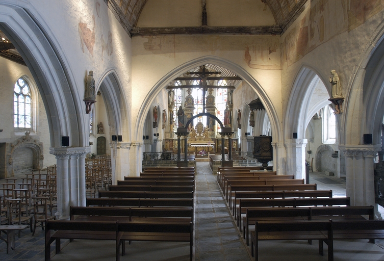 Le passage entre la nef et le chœur est marqué par un grand arc-diaphragme, dont la sculpture des chapiteaux du côté sud n’a pas été complètement achevée. Ce chœur dont, en toute logique, l’architecture est plus riche que celle de la nef, a longtemps passé pour ne pas appartenir à la même campagne de construction que cette dernière. En réalité, il n’en est rien et cette hiérarchie est tout à fait habituelle dans l’architecture gothique bretonne. Au-delà de cette arcade, les piles du chœur sont édifiées sur la base d’un carré à pans coupés disposé en diagonale et flanqué de colonnettes en délit baguées à mi-hauteur. L’ensemble, faces obliques et demi-colonnes, est couronné d’un unique chapiteau monolithe à corbeille continue, renflée et ornée de feuillage au-dessus des colonnes, en simple méplat sur les pans coupés. Les bagues ornant les piles, loin d’être purement décoratives, servent également à maintenir solidaires avec le noyau des piles les colonnettes appliquées en délit. Cette mise en œuvre, rare et probablement unique dans un édifice breton, puise sans doute son inspiration dans les très nombreux exemples anglais des XIIIe et XIVe siècles.