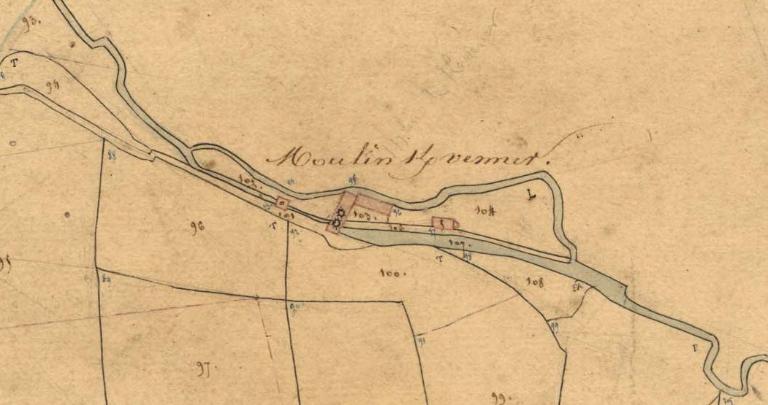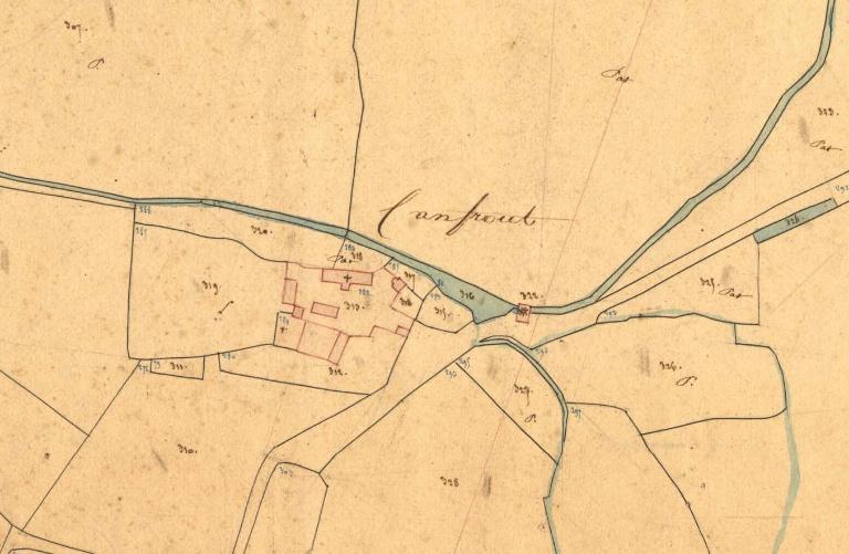 Plounévez-Lochrist. Cadastre napoléonien, section E2 de Traon Julien. Levée par M. Dyèvre, géomètre, 1837, échelle 1/2500 e.