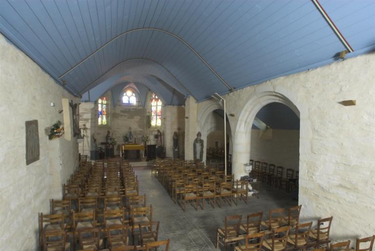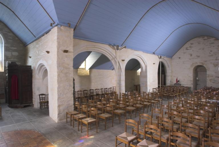 L'intérieur est lambrissé sans entraits ni sablières. Les grandes arcades surbaissées de la nef pénètrent directement dans les piliers cylindriques.
