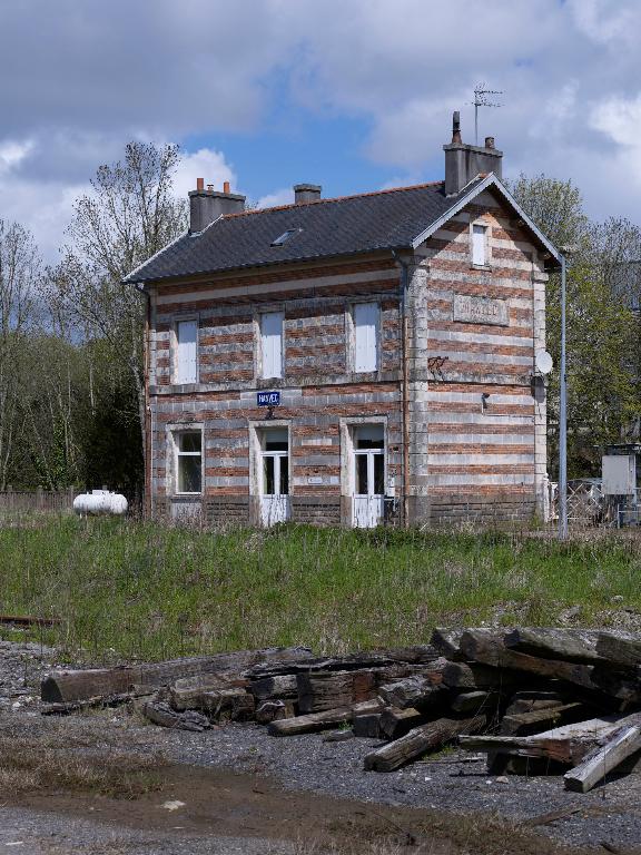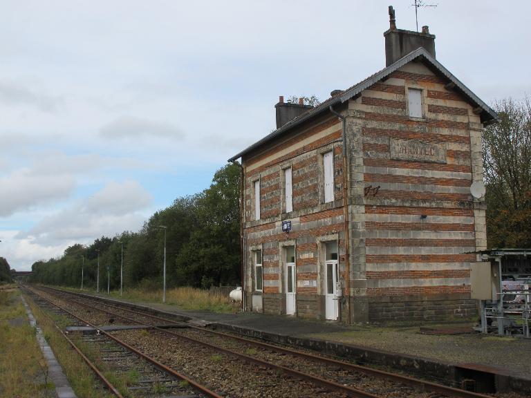 Gare de plan rectangulaire à étage carré, comble à surcroît et élévation ordonnancée. Soubassement en pierre de taille de granite, mise en oeuvre en brique et calcaire à assises alternées, pilastres aux angles, bandeau en relief au premier étage. Toit débordant en ardoise. A quelques mètres au sud de la gare, maison de garde-barrière et réservoir d'eau cylindrique orné d'arcades en arc segmentaire sur piliers à assises alternées de brique et calcaire.
