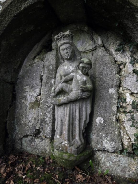 L'eau de la fontaine passe par un premier petit bassin rectangulaire puis par un second ovoïde. Entourée de murets en kersanton, en mauvais état, l'accès était protégé des animaux par des échaliers en schiste. Le dallage est en kersanton. La Vierge à l'Enfant, en kersanton, est posée sur un socle et dans une niche sommée d'une coquille saint-Jacques. La date et les inscriptions (peu lisible) sur le claveau. La Vierge à l'Enfant, bien que grossièrement sculptée (pieds de l'Enfant) possède une couronne fleurie, un vêtement au drapé lourd et des chaussures à bouts pointus.
