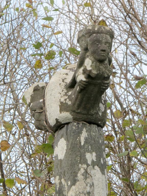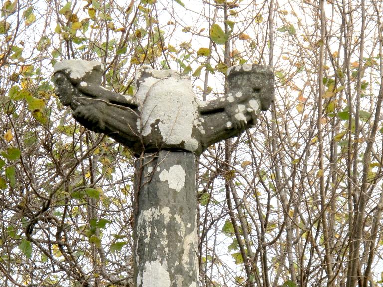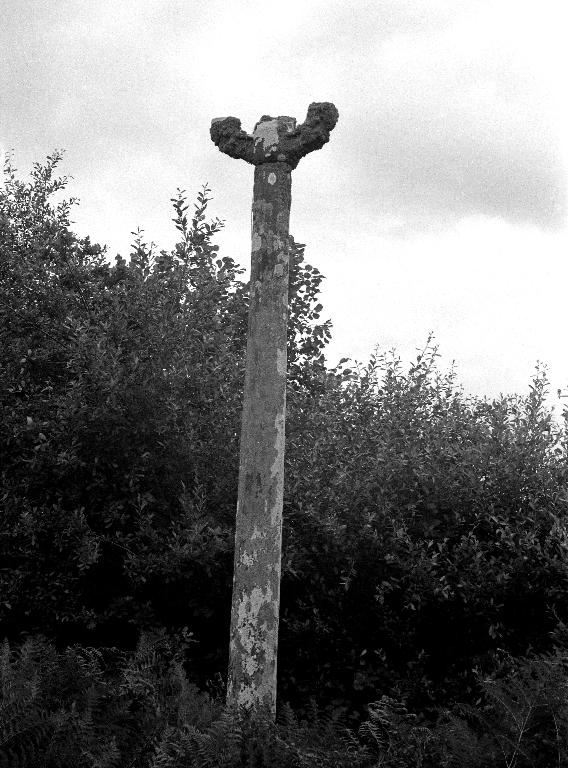 Socle rectangulaire ; Fût de schiste à pans ; Anges et instruments de la Passion ; croix sommitale disparue.