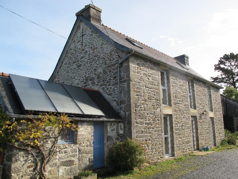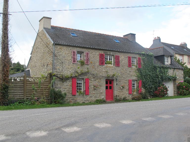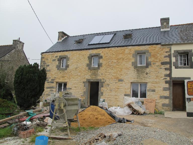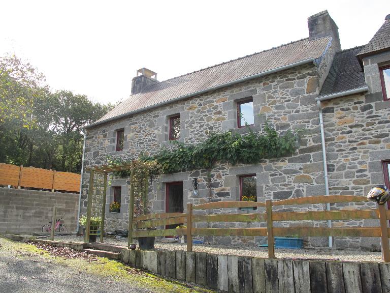 Matériaux et mise en œuvre : La microdiorite quartzique est très souvent utilisée, que ce soit pour le gros-œuvre ou pour les encadrements. Associé à une mise en oeuvre de qualité cela concerne des logis qui ont fait l'objet de dossiers d'étude (Kerbiaouen, Pen ar hoat, Guernevez, Hélléouët). Le Kersanton, d’extraction locale, se retrouve aussi dans le gros-œuvre soit sous forme de moellon soit en encadrement (Pen ar hoat, Le Lannec). Il arrive qu’on le trouve sous forme de boule, comme au moment de son extraction (Kerascoët). Il peut être aussi sous forme de monolithe de taille exceptionnelle lorsqu’il est utilisé en base de construction ou encore en encadrement (Kerascoët). Son usage demeure cependant rare dans la partie rurale avant la fin du 19e siècle. Il est très fréquemment utilisé pour les encadrements des ouvertures des maisons de la fin du 19e siècle et du 1er quart du 20e siècle. Le schiste est aussi utilisé en gros-ouvre : Runoter, Kerascoët. L’utilisation de granite en moellon avec insertion de schiste est assez fréquente. On trouve parfois trace d’argile utilisée comme liant.