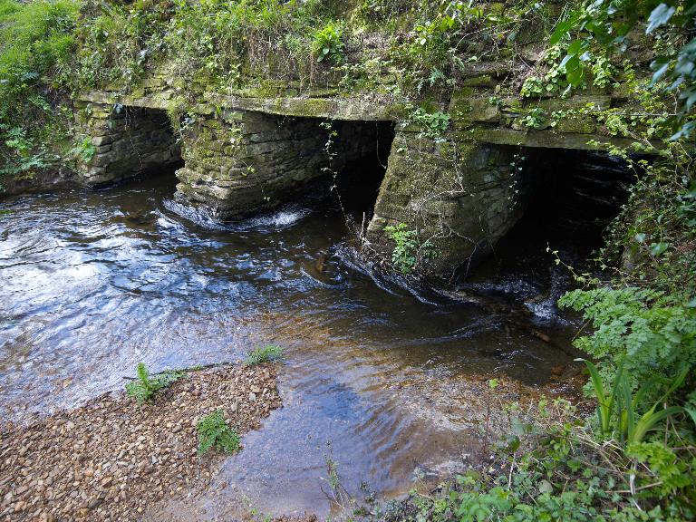 Pont en moellon équarri de schiste, à deux piles et trois passages d'eau surmontés de linteaux en schiste qui soutiennent le tablier et le parapet.