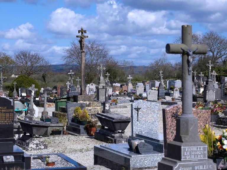 Croix de cimetière édifiée au 16e siècle dans le cimetière qui entourait autrefois l'église paroissiale, déplacée dans l'actuel cimetière lors de son transfert à l'entrée nord-ouest du bourg d'Hanvec.