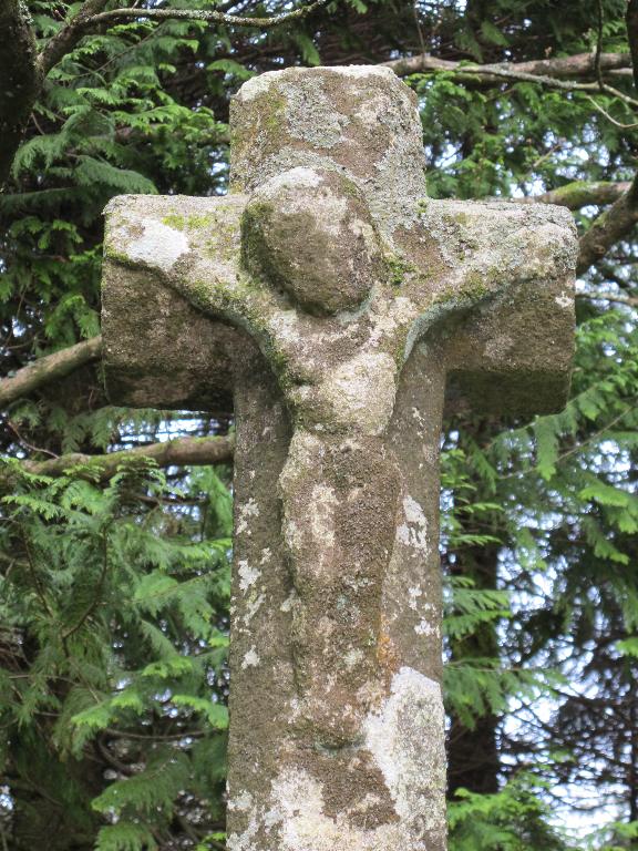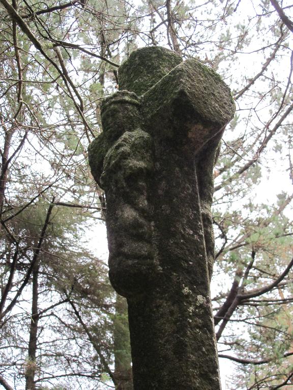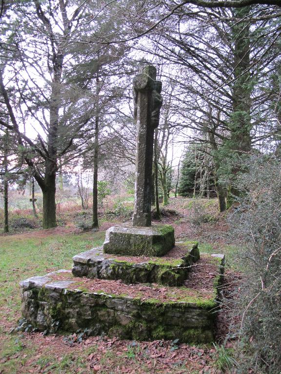 Croix de chemin monolithe en granite à branches courtes, fût et socle chanfreinés ornés de griffes. Christ en croix sur la face, Vierge à l'Enfant sur le revers. Emmarchement à deux degrés.