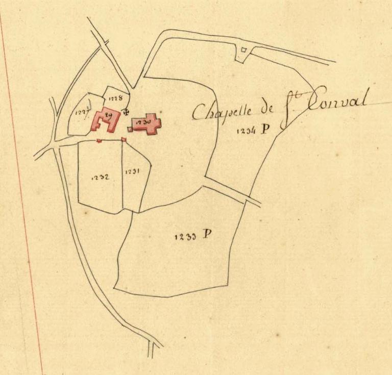 Jugée en mauvais état et trop excentrée dans la forêt du Cranou, la chapelle Saint-Conval de la fin du 16e siècle est détruite en 1942, à la demande du recteur Le Moign. Seules la croix et la fontaine de dévotion restent en place. Une nouvelle chapelle Saint-Conval est reconstruite la même année à Toulboën en remployant notamment les pierres du vieux clocher. L'ancienne chapelle, à plan en croix latine, est figurée sur le cadastre napoléonien, à côté de la croix. Son souvenir est conservé sur une photographie ancienne du début du 20e siècle, où l'on distingue l'auvent sur poteaux de granite qui abritait la table d'offrande engagée dans le mur au côté droit de la porte ouest.