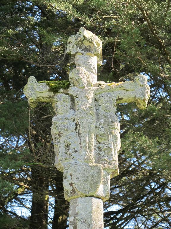 Calvaire en granite. Fût chanfreiné à griffes sur socle cubique et soubassement à trois degrés. Croisillon monolithe à branches rondes et fleurons carrés, à personnages serrés et géminés formant un bloc compact sans découpes.