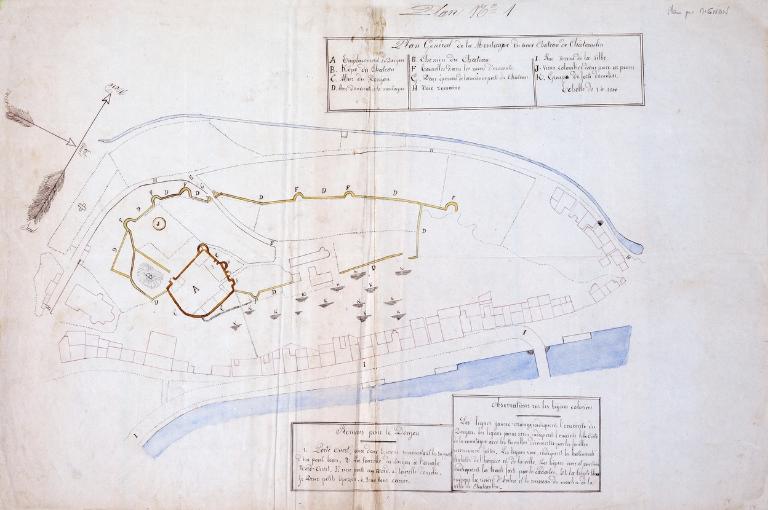 Jacques Cambry y voit un vieux château qui domine l'Aulne. Jean-François Brousmische est plus précis : "Vers le 10e siècle, sur un monticule qui domine la ville, la rivière et le pays, fut édifié un fort château. On en voit encore aujourd'hui les fondations ; l'enceinte en est encore visible, on peut en suivre la trace, juger facilement de son étendue aux débris répandus sur le sol ; des fragments de tours restent encore debout ; ce sont les témoins vivants de l'importance de cette fortification, qui depuis longtemps est cependant anéantie."