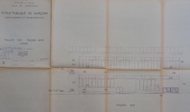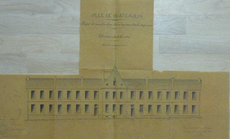 En 1881, 160 élèves sont scolarisés à Châteaulin. Le projet d'école prévoit, selon le respect des normes nationales, 40 élèves par classes. Le projet de construction de la nouvelle école des garçons est proposé par Armand Gassis, architecte de la ville de la Châteaulin, pour la somme de 47 700 francs (dont 1700 francs pour les bandeaux, corniches et chaînages d'angle en pierre de taille).