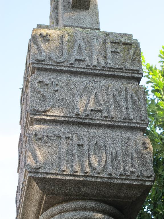 Croix située au carrefour de Kergudon et zone de Pen ar roz portant les inscriptions suivantes : EN RECONNAISSANCE KERLUAN 1946/ST PER, ST POL, ST ANDRE, ST JAKEZ, ST YANN, ST THOMAS, ST JAKEZ, ST FILIP, ST BERTHELE, ST MAZE, ST SIMON, ST THADDE.