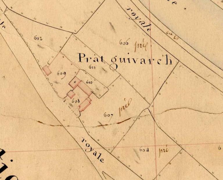 Ferme portant la date de 1761, située en bordure de l'ancienne voie royale n°170. A probablement été un relais du fait de son emplacement. L'intérieur a été rénové il y a peu. Cette ferme est contemporaine de celle de Coatifitel (même date portée) : les encadrements de baies de la façade principale sont de même qualité. La pente de toit ainsi que les dimensions des souches de cheminées font de cette maison de ferme un exemplaire unique sur la commune dont la construction est probablement antérieure à la date portée sur le linteau de l'étage.