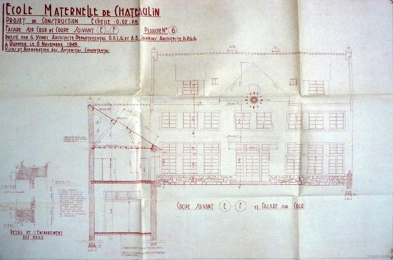 Incendiée durant la dernière guerre, l'école maternelle, construite en 1866-1868, ne peut plus recevoir les enfants. En 1949, 100 enfants de maternelles sont accueillis dans des baraques. Inscrits au plan prioritaire de 1949 par le service départemental de la reconstruction, les travaux de l'école "Louis Kernéïs" commencent en 1950 d'après les plans de G. Yvinec et A.B. Jenkins sur le terrain précédemment occupé par l'ancienne école.