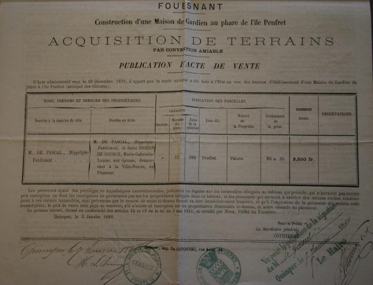 La maison d'habitation des gardiens de phare de l'île de Penfret est construite entre 1879 et 1881. L'acte de vente à l'amiable s'est fait entre l'Etat, l'acquéreur, et M. de Pascal, Hyppolite Ferdinand et dame Bigeon de Courcy, Marie-Gabrielle-Louise, son épouse, demeurant à la Ville-Neuve en Plomeur. La vente s'est faite à hauteur de 2500 frs de terrain de pâture sur l'île de Penfret. La maison d'habitation est composée de trois logements accolés et indépendants à destination des gardiens de phare de l'île de Penfret. Ces maisons ont été élevées dans l'enceinte d'un enclos d'une zone militaire. Elles appartiennent maintenant au Conservatoire du Littoral et laissées en gestion à l'école de voile des Glénan.