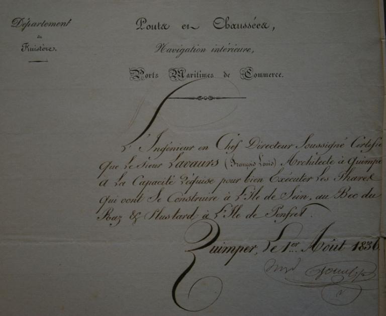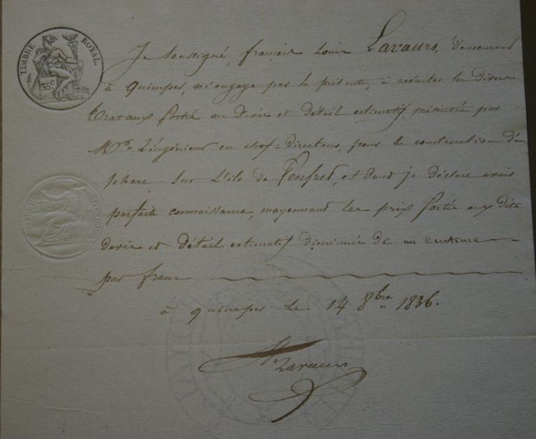 Projet d'un phare à éclipses de 3ème ordre à construire sur l'île de Penfret par M. de Kermel, ingénieur en chef, 20 décembre 1835.