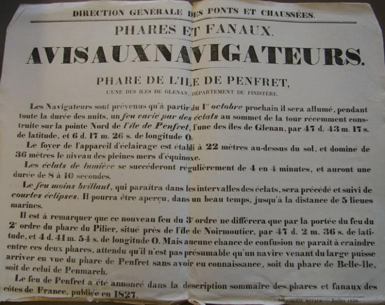 Le phare est mis en service le 1er octobre 1838 et émet un feu fixe varié de quatre en quatre minutes par des éclats de lumière blanche précédés et suivis d'éclipses. En 1898 le feu de Penfret est transformé en feu éclair à éclats rouge réguliers toutes les cinq secondes.