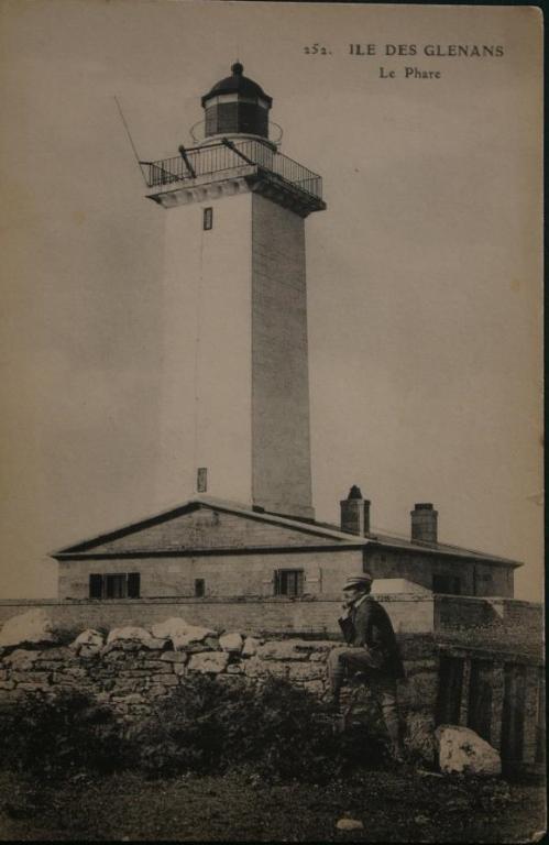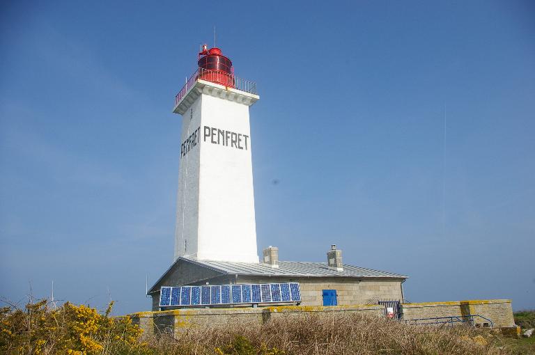 Phare construit au nord de l'île de Penfret sur un terrain privé appartenant à M. de Kernaflen de Kergoz qu'il a cédé à l'Etat. Tour carrée construite en pierre de taille en granite, d'une hauteur de 24, 25 m au plan focal. Un fortin militaire a été construit autour du phare en 1847. Le fort et les douves qui l'entourent forment un ensemble de fortifications. La tour peinte en blanc est surmontée d'une corniche ceinte par un garde-corps métallique peint en rouge. Les vitres teintées en rouge de la lanterne sont fixées sur un soubassement de pierres peintes en rouge.