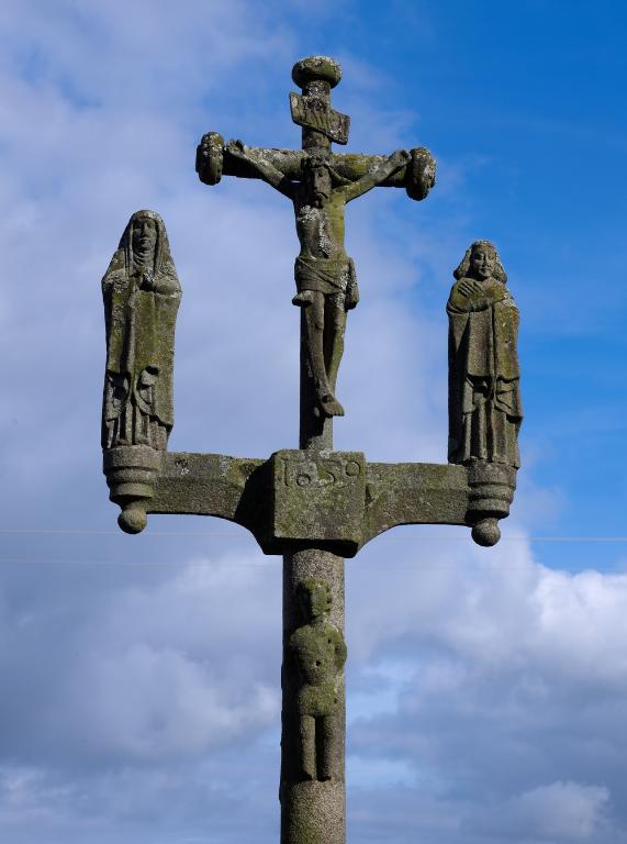Calvaire en granite et kersantite composé de trois degrés, le premier à large corniche en cavet, sur socle cubique. Le fût porte en relief saint Sébastien et saint Roch, les croisillons reçoivent les statues de la Vierge et saint Jean. Croix à branches rondes, fleurons-boules, crucifix.