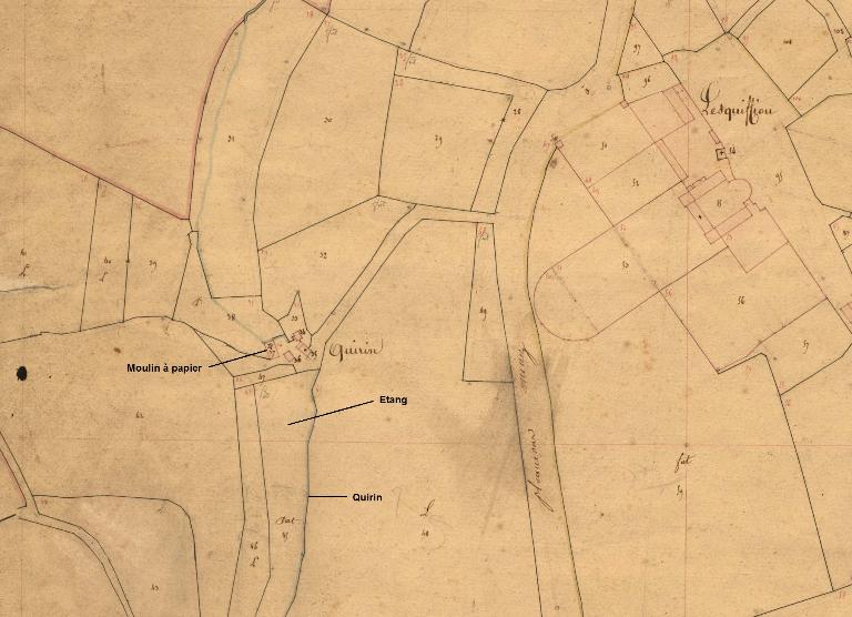 Le moulin à papier de Quirin est bâti, entre 1762 et 1765, par le Marquis de Lesquiffiou, François Claude de Lescoët. Il est construit à la suite de la transformation du manoir ancien en château moderne. La famille de Lesquiffiou, qui fait partie des premiers fondateurs des moulins de la vallée du Queffleuth, si elle possède encore des droits de féage sur quelques moulins à papier, n’en a plus la maîtrise directe, en ce milieu du 18ème siècle.