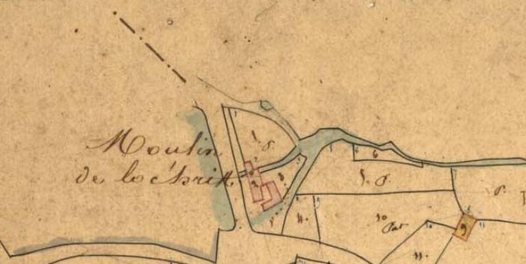 Sur le dessin de Le Guennec, on distingue très bien le moulin à gauche, devant sa retenue au premier plan.