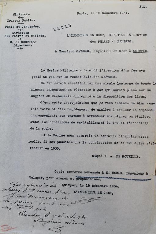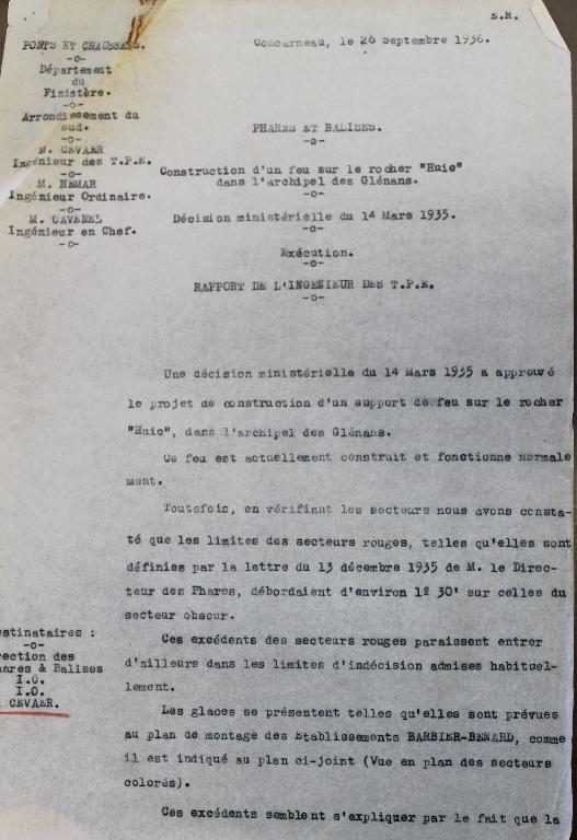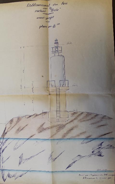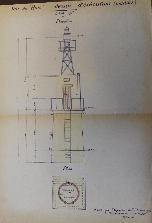 Feu désaffecté du Huic, situé au nord de l'île St Nicolas de l'archipel des Glénan. Ce feu a été construit en 1935 et mis en service le 1er juillet 1936 à la demande de la Marine Nationale. Un accord financier est prévu pour la construction du feu. Dans une lettre du 26 septembre 1936, il est écrit qu'une décision ministérielle du 14 mars 1935 a approuvé le projet de construction d’un support de feu sur le rocher « Huic », dans l’archipel des Glénan. Un avis aux navigateurs daté du 28 mai 1936 informe qu’un feu est en cours d’installation sur le rocher « Huic » dans les Glénan. Ce feu présente les secteurs suivants : un secteur rouge de 32° entre les relèvements à 73° et à 105°. Un secteur vert de 14, 7° entre les relèvements à 105° et à 252°. Un secteur rouge de 16° entre les relèvements à 252° et à 268° et un secteur obscur. Il aura les caractéristiques d’un feu à occultations régulières toutes les six secondes selon le rythme approximatif suivant : lumière 4 secondes, occultation 2 secondes. Les portées lumineuses seront de 8 milles et 3 milles dans les secteurs rouges, 6 milles et 3 milles dans le secteur vert. Le feu sera mis en service vers le 1er juillet 1936.