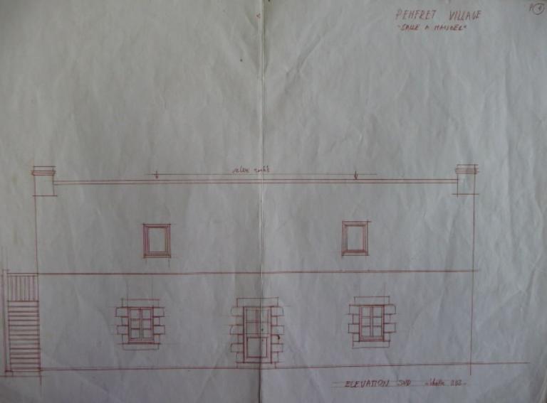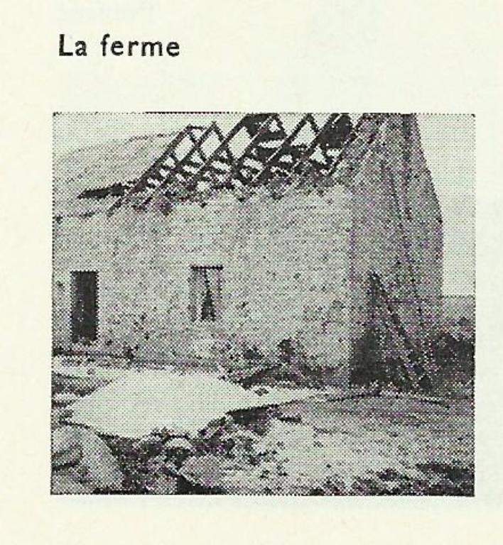 Le bâtiment, de plan rectangulaire, est constitué de deux murs pignons aveugles avec cheminées, orientés ouest et est. La façade arrière, nord, comprend une porte côté ouest. En 1952 la parcelle et des bâtiments ont été rachetés par le Club de formation internationale pour les jeunes, en vue de l'aménagement des ruines de la ferme et de la construction d’une mezzanine qui servira de bureau.