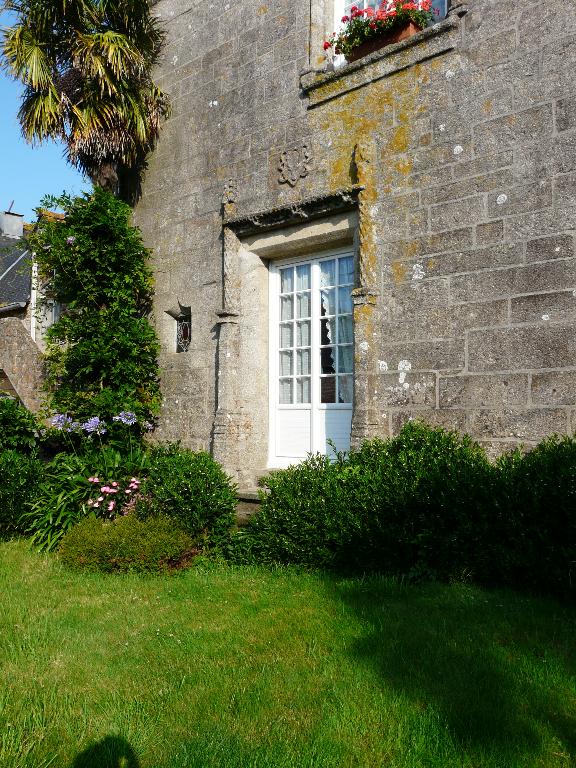 Au rez-de-chaussée, sa façade principale, orientée au sud, est percée de deux portes et d'une fenêtre. A l'extrémité est, la porte d'origine est ornée d'un linteau sculpté et encadrée par deux pilastres engagés, munis de bases et de chapiteaux sculptés, sur lesquels s'appuient deux pinacles prismatiques. Au-dessus du linteau, le blason des Ansquer est sculpté. Cette porte est flanquée à l'est d'une ouverture de petites dimensions, munie d'un vitrail représentant le même blason. Au centre de la façade, la nouvelle porte d'entrée supplante une fenêtre originelle. Elle est couverte par un linteau comportant une série de moulures saillantes. A l'extrémité ouest se trouve une fenêtre au linteau mouluré.