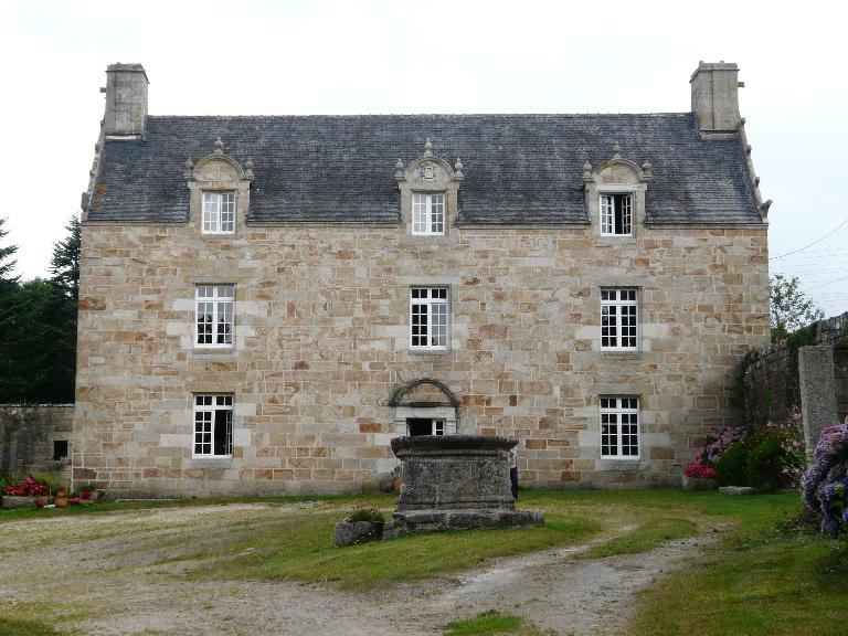 Sa façade, refaite au XVIIe siècle, est ordonnancée en trois travées. Orientée au sud, elle est percée dans sa travée centrale par l'entrée, matérialisée par une porte tiercée, qui est couverte d'un fronton cintré mouluré en saillie. L'encadrement de cette porte est orné de deux pilastres engagés surmontés de chapiteaux sculptés supportant un linteau mouluré, lui-même supportant le fronton. Les deux fenêtres du rez-de-chaussée sont similaires aux trois autres de l'étage : de forme rectangulaire, elles sont munies d'un chanfrein à angle droit. Le niveau de combles, présentant un surcroît de maçonnerie, est éclairé par trois lucarnes à frontons cintrés, moulurés, et munis chacun de trois pot à feu. Sur le fronton de la lucarne centrale figure un écusson orné. Une corniche moulurée en forme de doucine relie la maçonnerie au toit.