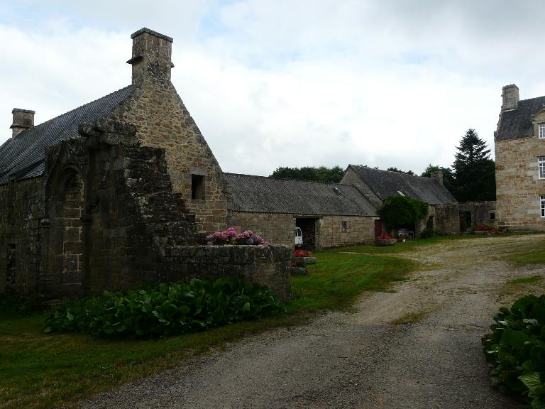 Sur le pignon est de cet édifice s'appuie le portail d'entrée. Celui-ci est couvert par un arc en plein cintre dont le voussoir comporte une série de moulures, qui retombe sur deux pilastres engagés, dotés de bases et de chapiteaux sculptés. Au dessus de cet arc une accolade ornée de crossettes feuillagées est sculptée, sa partie haute a été détruite. Cette accolade retombe sur deux pinacles sculptés. Les bases de ceux-ci sont flanquées de deux figures sculptées représentant un lion. A l'est de ce portail se trouvent les ruines d'un mur de clôture.