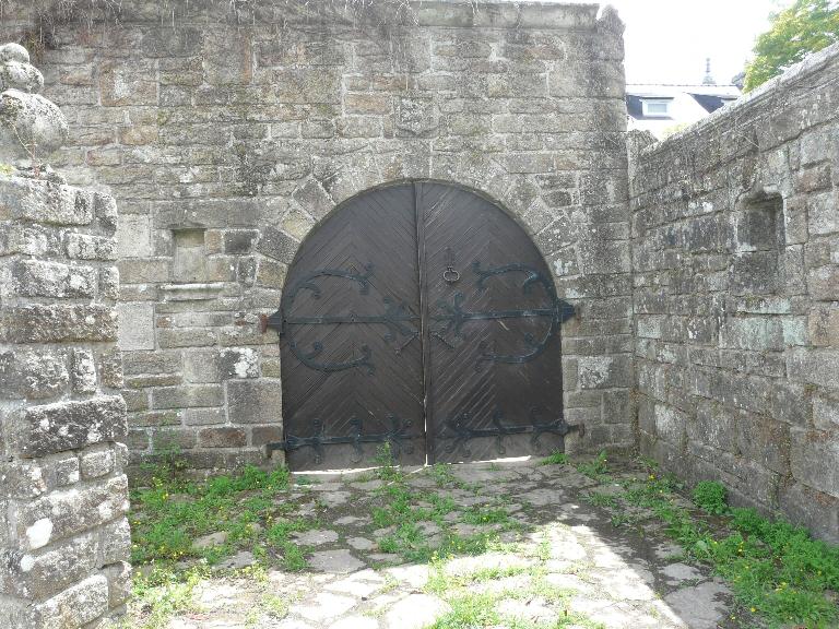 Le second portail, à l'arrière du manoir, est beaucoup moins décoré. Il s'agit une porte cochère, maçonnée en pierre de taille et moellons équarris. On y trouve une porte avec deux vantaux en bois sur lesquels sont fixés des ferronneries datant probablement du XVIIIe siècle. Le portail est couvert par un arc en plein cintre dont la clé de voûte est surmontée d'une pierre sur laquelle est sculpté un blason aujourd'hui illisible. Ce portail est flanqué de deux niches coiffées d'une accolade et chanfreinées : l'une, côté est, avec une pierre d'appui dotée de moulures, et l'autre, côté ouest, sur le mur de clôture en retour d'équerre.