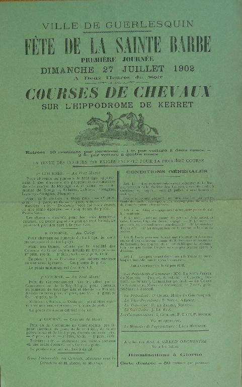 La société des courses de Guerlesquin est créée en 1900. Le budget de 1924 indique 700 F de dépenses de constructions. En 1955, les dommages de guerre permettent l'édification d'une tribune de juge à l’arrivée. Estimé à 350 000 F, le projet, signé de L. Heuzé père et fils, L. de Lafforest et Ch. Le Janne, bénéficie d'un permis de construire le 18 mai 1955. Les travaux s'achèvent le 24 août suivant. En 1998, d’importants travaux de rénovation, notamment des tribunes et des pistes, sont entrepris par la Société. En 2000, l'équipement de l’hippodrome s’enrichit d’une salle polyvalente avec grand écran permettant la projection des courses en direct, restaurant panoramique et bloc technique. L’hippodrome accueille deux fois par an en juillet des courses de trot et de galop (plat et obstacle).