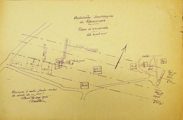 dehors de la veine et atteint 90 mètres de fond. En 1924, une centrale électrique est activée grâce à une machine à vapeur. Cela permet d’alimenter les pompes à exhaure, l’extraction, l’éclairage et la perforation mécanique. Les associés employaient 30 ouvriers au fond et 20 en surface en 1925, date de fermeture de l’ardoisière.