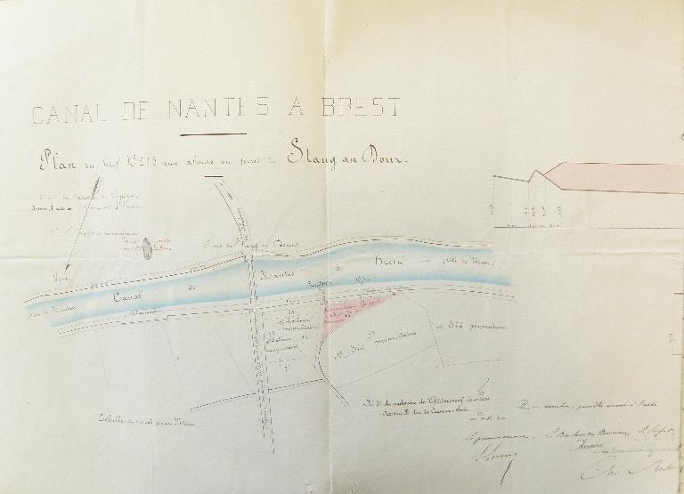 En 1856, l’ardoisière est exploitée et possédée par M. Stenfort. Ce dernier souhaite faire reconnaitre son droit à desservir la carrière par le marchepied du canal de Nantes à Brest, le long du bief n°23. Avant la canalisation, la carrière était desservie par un chemin sur lequel le marchepied a été établi. Ce droit de passage sera reconnu mais sous les conditions que toute dégradation causée par l’emploi du chemin sera réparée.
