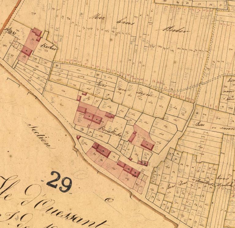 Ecart de Keralloch : maisons implantées en alignement, soit au centre soit en partie nord de parcelle dédiée à l'aire à battre. L'alignement sud a été complété au cours du 19 et début du 20e. Les maisons que le composent sont assez dénaturées (ouvertures, encadrement) même si les volumes ont été conservés. A noter cependant, une maison qui a conservé ses ouvertures initiales. Un bâtiment de la seconde moitié du 19e intègre des pierres issues de l'ancien château ou de l'ancienne chapelle.