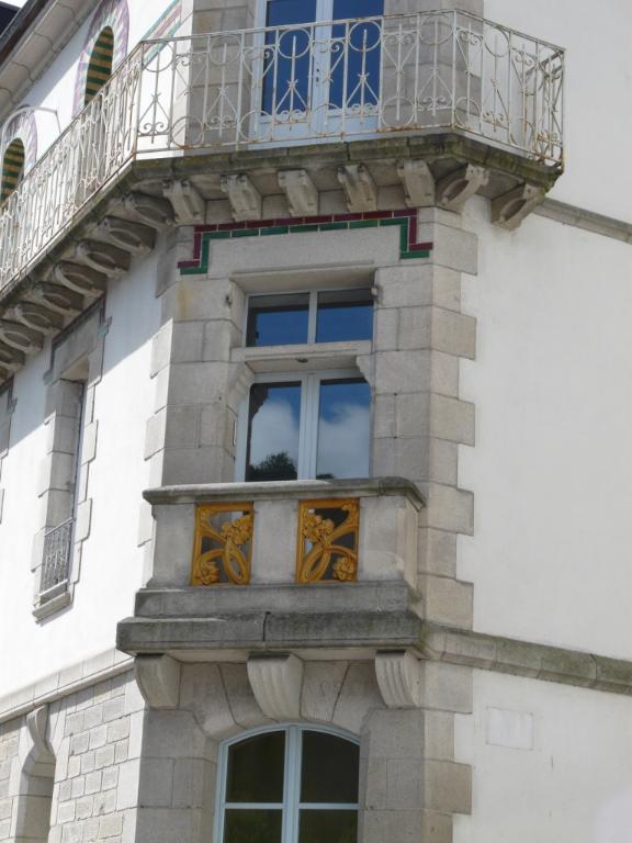 Le premier corps de bâtiment possède une façade faisant face à la rivière de l’Odet. Elle est richement décorée et étant située au sud elle bénéficie d’un large ensoleillement. Sur cette façade, chaque étage est percé de deux fenêtres dont l’une est large et l’autre étroite. Le rez-de-chaussée présente un appareillage régulier en pierre de taille de granit. Les deux fenêtres sont couvertes d’un arc surbaissé avec clé à triglyphes saillante et passante, les jambages et l’arc sont dotés d’un chanfrein. Le premier étage est éclairé par deux fenêtres couvertes d’un linteau droit monolithe et elles possèdent un garde-corps en fer forgé. Les jambages sont dotés d’un chanfrein, le linteau est orné d’un cavet. La forme du linteau est soulignée par un bandeau décoratif de briques rouges, et un autre de briques vertes. Au deuxième étage se trouvent deux fenêtres couvertes d’un arc en plein cintre et toutes deux sont précédées d’un balcon filant en fer forgé reposant sur des consoles et se prolongeant jusqu’au pan coupé. Les deux fenêtres sont couvertes d’un arc présentant une alternance de briques rouges, jaunes et vertes disposés en éventail. En outre, un bandeau horizontal de briques de mêmes teintes se loge entre les fenêtres. La brique vernissée est un matériau régulièrement employé par Charles Chaussepied dans ses réalisations. Par ailleurs le rouge, le vert et le jaune est la gamme de couleur souvent utilisée par l’architecte aussi bien pour des mosaïques de sol, des éléments de décor extérieurs ou des verrières. Les combles sont percés de trois fenêtres de toit, auparavant ils étaient éclairés par une lucarne en bois supprimée au cours du XXème siècle.