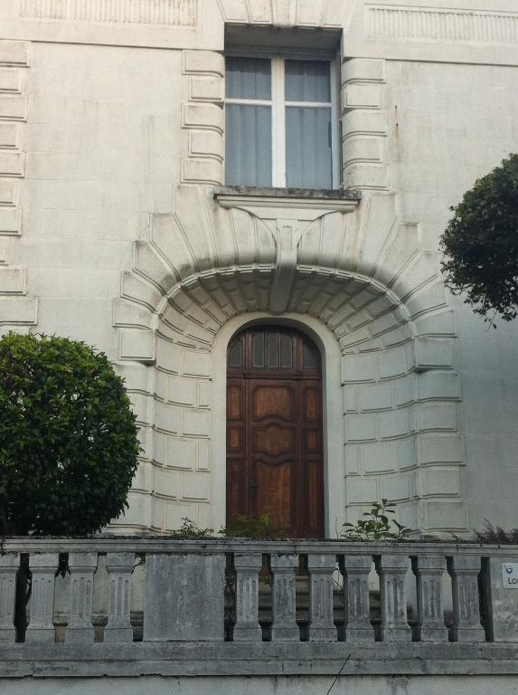 La façade est, s’organise en trois travées. Un perron avec des marches en béton mène à la porte d’entrée principale située à l’ouest. Cette porte en bois avec imposte vitrée est placée dans œuvre. Elle présente un encadrement courbe ainsi qu’un arc en anse de panier courbe avec crossettes en escalier et couronné d’une clé saillante. Les ébrasements et la voussure arrière nettement marqués sont également en fausses pierres de taille. La travée centrale est occupée par une porte fenêtre couverte d’un arc courbe en anse de panier à crossettes en escalier avec clé. Elle est précédée d’un garde-corps ouvragé en fer forgé de style art décoratif. Un faux chaînage sépare cette ouverture d’une ouverture plus large de même forme, qui doit probablement éclairé un vaste salon ou une salle à manger.
