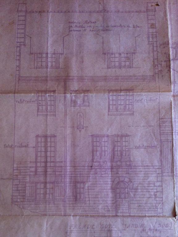 La façade sud est tournée vers le jardin et jouit d’un large ensoleillement, les ouvertures sont multiples. Le soubassement est en moellon de granit, alors que les niveaux supérieurs sont enduits. Le soubassement est occupé par le sous-sol, et est percé de trois ouvertures: deux fenêtres et une petite porte couverte d’un arc en plein cintre. Au rez-de-chaussée la pièce la mieux éclairée est la salle à manger qui ouvre sur le jardin par trois baies jumelées. La salle à manger était dotée d’une cheminée, les murs étaient recouverts de chaux et de plâtre, le plafond était en pin d’Oregon et le parquet en châtaignier. La salle à manger communiquait avec le bureau éclairé par une porte fenêtre précédée d’un garde-corps. Aujourd’hui il n’y a plus de cloison entre la salle à manger et le bureau, ce n’est plus qu’une seule pièce faisant office de salle à manger - salon. Au premier étage les deux fenêtres latérales éclairent des chambres et l’ouverture centrale composée de deux baies géminées les toilettes. Sur le plan de 1934, il est bien spécifié que les ouvertures latérales du rez-de-chaussée et du premier étage sont dotées de volets roulants. Deux lucarnes en chien couché permettent d’apporter une large luminosité aux combles. Sur la partie médiane de la façade sud se trouve une petite niche dans laquelle devait probablement siéger une statue.