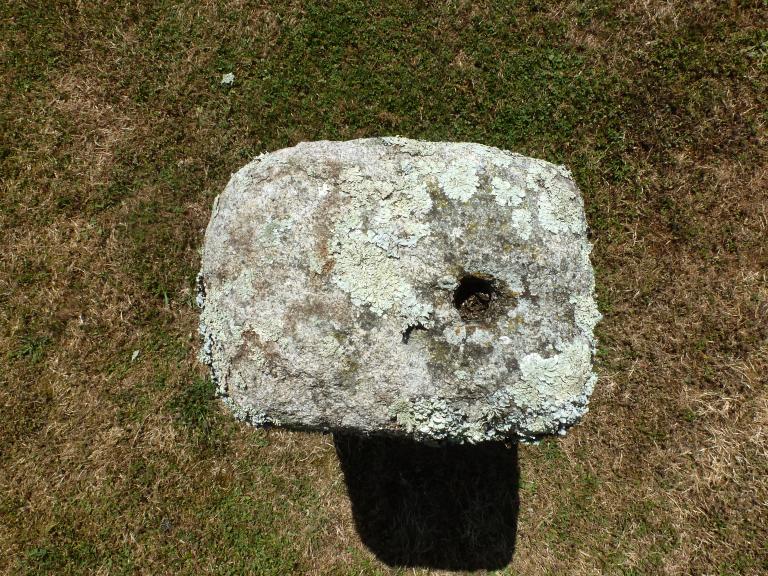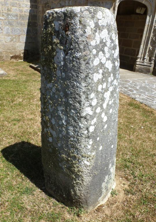 La stèle 2, appelée aussi « fuseau de Goulien », était, toujours selon lui, placée sur une base de croix élevée de trois marches, non loin de l’enclos paroissial (cf. carte postale). L’aménagement en creux sur le haut de la pierre montre qu’elle a un temps reçu une croix, comme cela se trouve sur d’autres stèles de ce type. La croix en question est maintenant dans l’église.