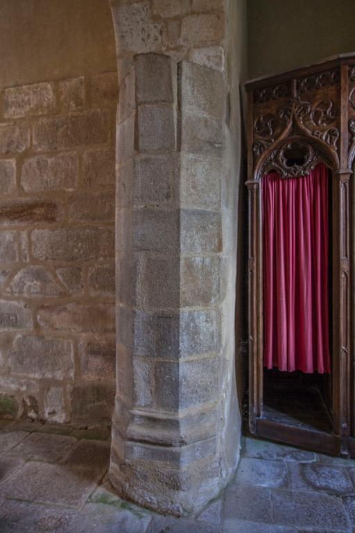 À l’intérieur, la nef est flanquée de deux collatéraux divisés en quatre travées, l’ensemble indique le milieu du XIIe siècle. Le vaisseau central est séparé des bas-côtés par une série d’arcs en berceau supportés par des piles rectangulaires chanfreinées aux angles au tailloir mouluré en cavet à hauteur d’imposte. La reconstruction moderne de la façade occidentale se devine sur les piliers engagés de la première travée qui devaient – semble-t-il – accueillir une arcade à pénétration directe. Les charpentes de la nef et des bas-côtés ont été refaites par la fabrique en 1828 comme le montre une inscription sur un des entraits du bas-côté sud : FAIT. FAIRE. PAR. PIERRE LE LVREL. FABRIQVE. 1828. Les piliers engagés à pans multiples de la dernière travée de la nef dénotent une phase de construction au courant du XIVe siècle correspondant au chantier du chœur et de ses chapelles. Il est séparé de la nef par un arc triomphal en arc brisé aux voussures simplement chanfreinées qui reposent sur des piliers engagés à faisceau de cinq colonnettes frappées au nord d’un écu à trois cotices. Le chœur est flanqué de deux chapelles subsidiaires, une dédiée à Sainte-Anne, l’autre à Saint-Jean divisées en deux travées par deux arcades en tiers-point qui s’appuient à leur rencontre sur une fine colonne octogonale. Ces arcades - en particulier les fines piles octogonales - semblent plus récentes que le reste de l’élévation du chœur. Plusieurs visages sculptés rythment les sablières nord et sud du chœur. La chapelle dédiée à Saint-Jean au nord enferme un ensemble statuaire remarquable de la seconde moitié du XVIe siècle. Au mur pignon oriental, dans une cavité rappelant un enfeu, un groupe de statuettes figure la scène de la Nativité, les détails de la charpente de la grange sont peints au fond de la crèche. Au-dessus, un haut-relief empruntant la composition d’un retable évoque plusieurs scènes christiques : à gauche, le Christ délivrant Adam et Eve des Enfers, au centre, une Crucifixion accompagnée de Saint-Jean et de Marie et à droite, un Christ en Majesté sur un trône grossièrement taillé. L’ensemble est cerné de colonnettes toriques dépourvues de chapiteau et se prolongent en une accolade qui surmonte la crucifixion. A quelques mètres contre le chœur, un gisant figurant le Christ sur son sépulcre manifeste une fois de plus la pleine dévotion du Saint-patron de la chapelle Saint-Sauveur de Coadry.