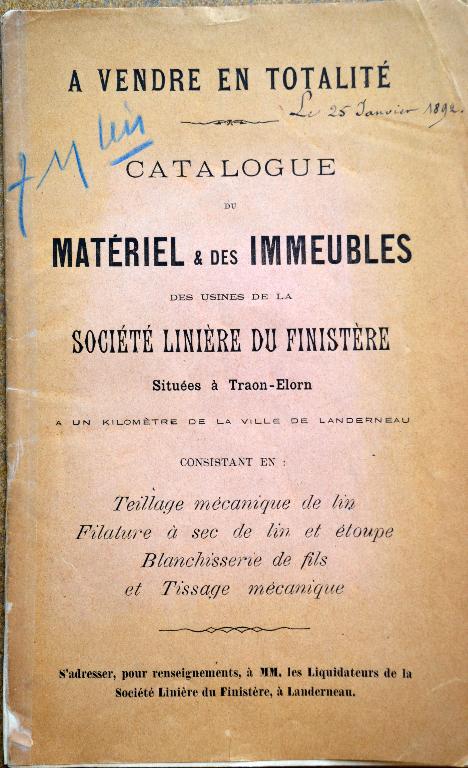 A VENDRE EN TOTALITÉ CATALOGUE DU MATERIEL & DES IMMEUBLES DES USINES DE LA SOCIÉTÉ LINIÈRE DU FINISTÈRE
