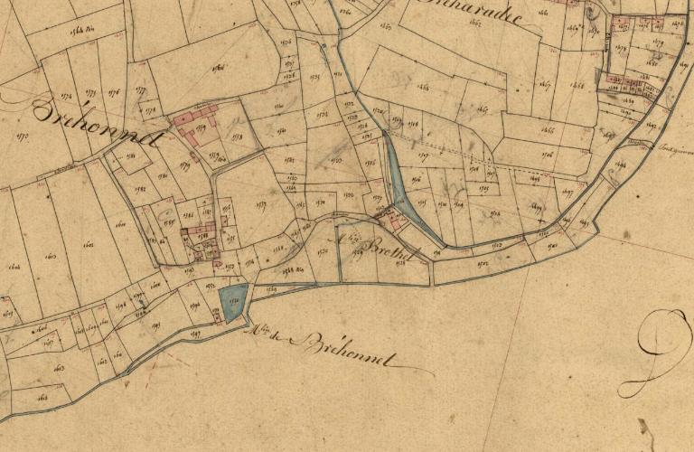 Le cadastre de 1836 montre une ferme qui ressemble à celle décrite dans les archives du 18e siècle : On voit bien les deux moulins attenants sur le canal qui sort du bassin de retenue, une maison d’habitation, un bâtiment attenant abritant probablement les vaches et le cheval et une crèche plus petite, à l’écart, comme il est de coutume pour les cochons.